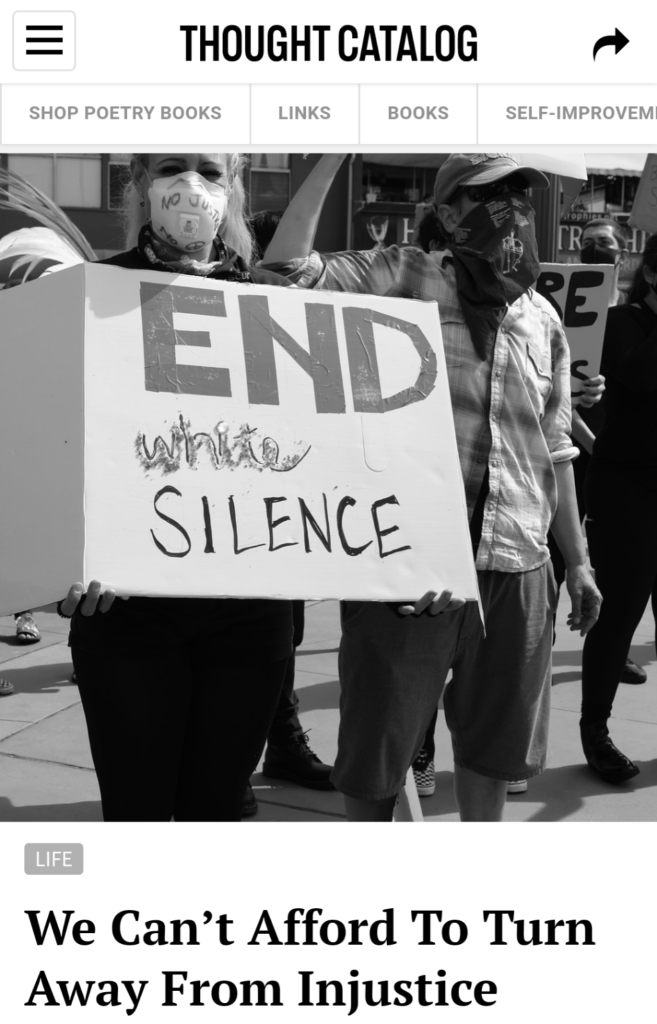 August 28, 2020 laurensuchenski Thought Catalog This new piece published on Thought Catalog about inequality was also given a feature: We Can’t Afford to Turn Away From Injustice Share this: Share on X (Opens in new window) X Share on Facebook (Opens in new window) Facebook Like Loading... Related